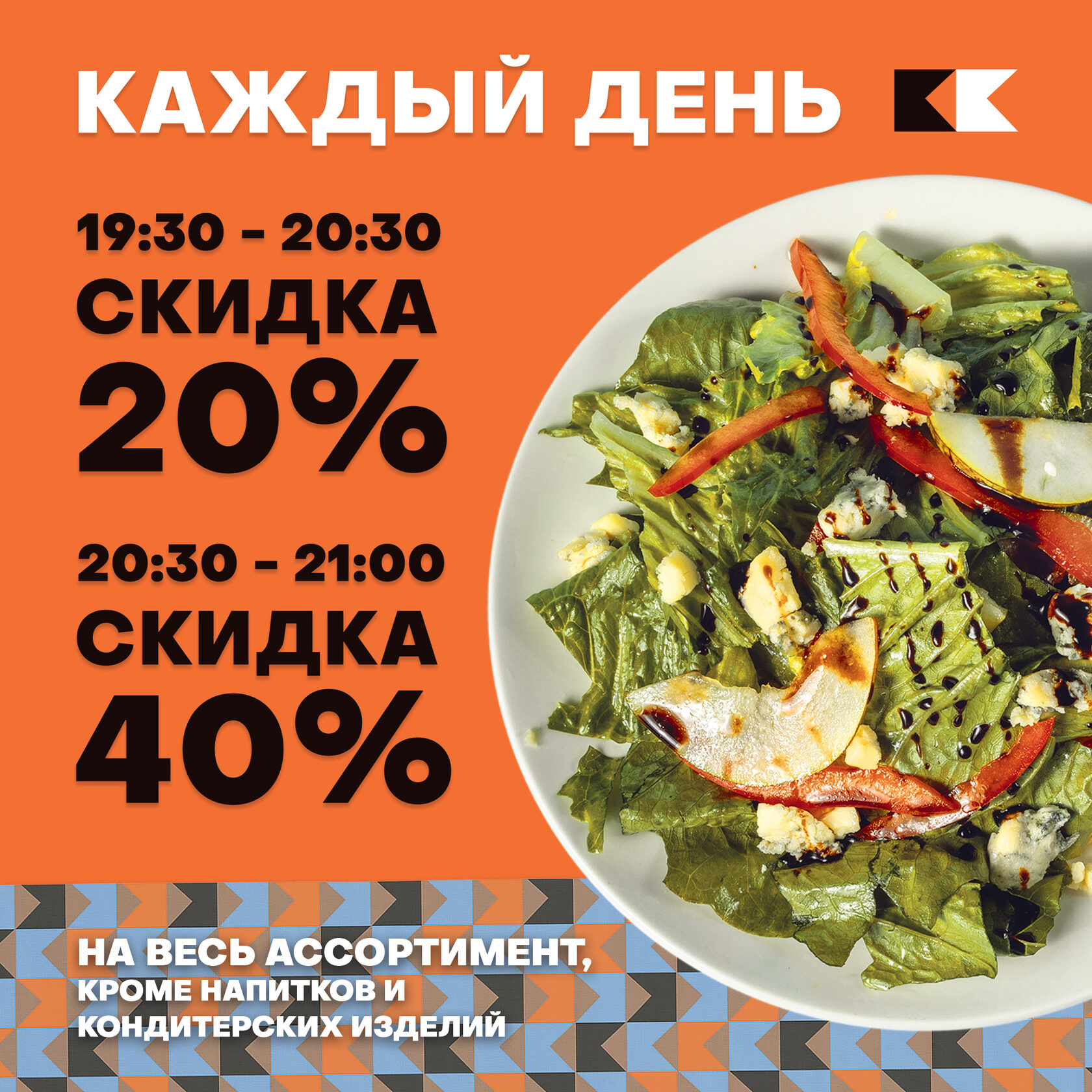 с 19:30 до 21.00 в Кулинарии скидка до 40% на весь ассортимент кроме кондитерских изделий!*